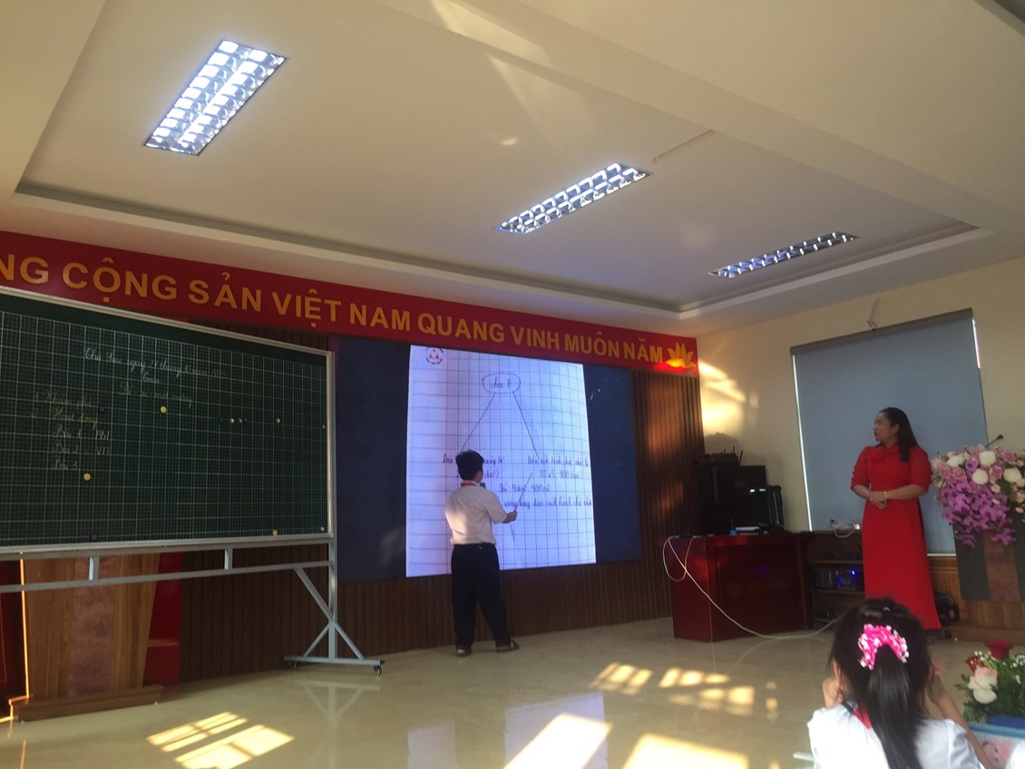 Tại tiết học thứ hai, cô giáo Phạm Thị Huế, giáo viên trường Tiểu học Đại Bản 2 thực hiện tiết dạy minh họa Toán lớp 4, bài 18: Đề-xi-mét vuông, mét vuông, mi-li-mét vuông gồm 3 tiết, tiết chuyên đề là Tiết 1 Đề -xi-mét vuông cùng các em học sinh lớp 4B trường TH Đại Bản 2.