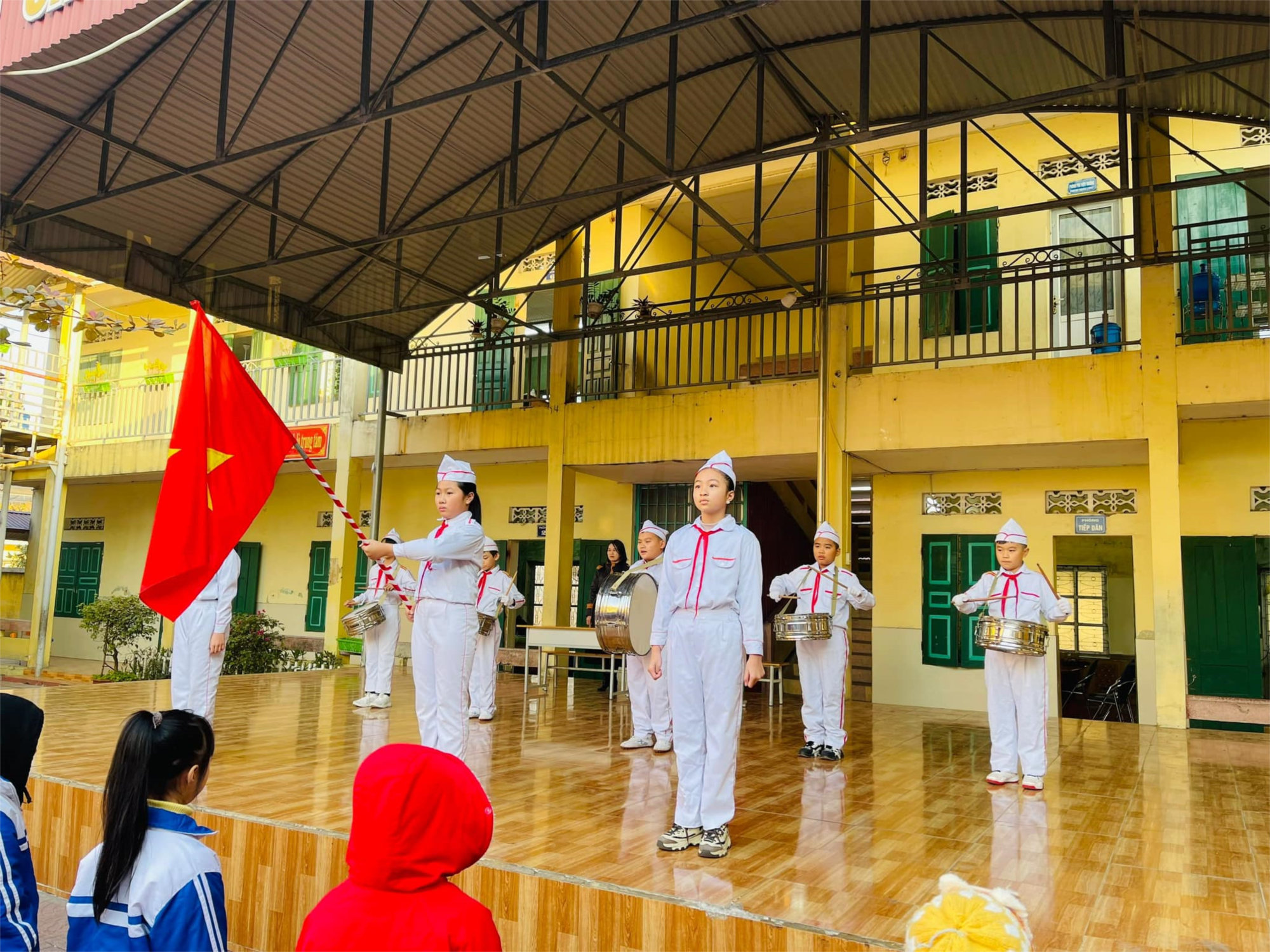 Trong lễ chào cờ cô giáo Tổng phụ trách đã tổng kết thi đua tháng 12, phát động thi đua tháng 1 và tuyên truyền tới các em học sinh các quy định về việc không sử dụng pháo nổ, vũ khí vật liệu nổ, các loại đồ chơi nguy hiểm vào dịp Tết Nguyên Đán Ất Tỵ năm 2025.