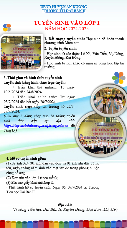 Trên đây là kế hoạch tuyển sinh lớp 1 năm học 2024 - 2025 của trường Tiểu học Đại Bản II. Nhà trường đề nghị các đồng chí cán bộ, giáo viên, nhân viên của trường nghiêm túc thực hiện. Trong quá trình thực hiện, có vấn đề gì thắc mắc cần báo cáo ngay về Hiệu trưởng để được hướng dẫn, giải quyết kịp thời./.
